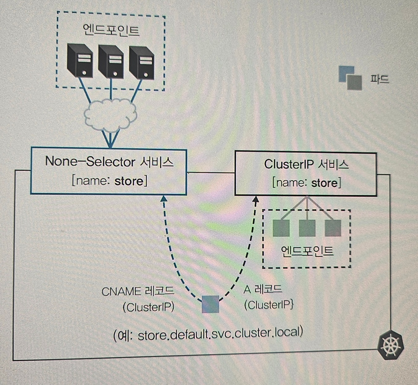 그에 반해, None-Selector 서비스는 서비스명으로 이름 해석을 하면 A 레코드로 반환한다.자신이 설정한 멤버에 대해 로드 밸런싱을 하며, Client-side 로드밸런싱용 엔드포인트를 제공하는 서비스라고 말할 수 있다.type: LoadBalancer를 지정하는 것도 가능하지만, 쿠버네티스 클러스터의 외부 로드 밸런서에서 수신한 트래픽이 쿠버네티스 클러스터로 전송된 후에 다시 쿠버네티스 클러스터의 외부로 전송하는 형태가 되므로 유용하지 못하다.이는 type: NodePort도 마찬가지다.
